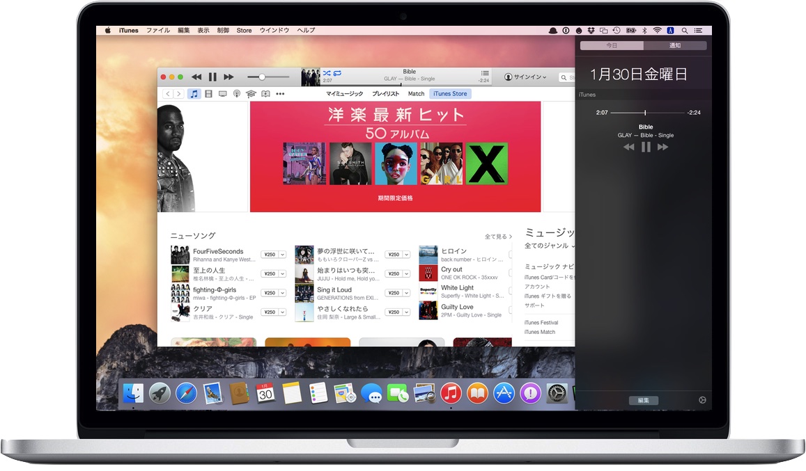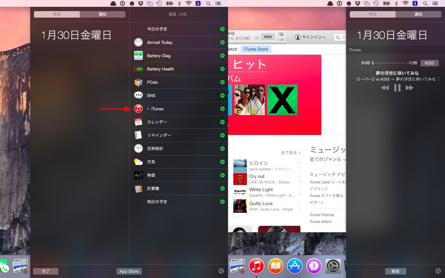 iTunes 12.1ではiOSデバイスとの同期パフォーマが改善される他、OS X Yosemiteの通知センター Widgetsに対応し、通知センターからiTunesのコントロールが可能になっており、iTunes Storeの曲を試聴している場合価格などが表示されます。