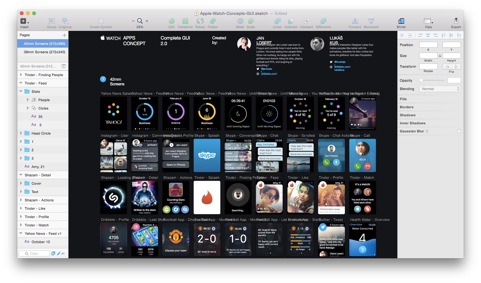 Apple Watch 42mmと38mmスクリーン用が含まれており、ダウンロードはJan Losertさんのサイト、またはSketch App Sourcesからダウンロード可能です。