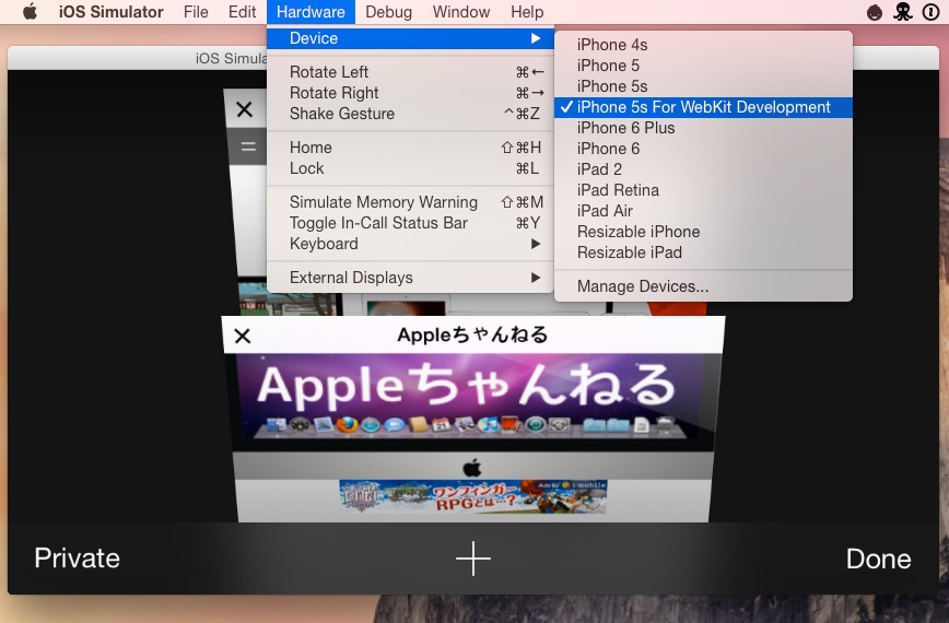 WebKit for iOS Simulatorはデバイスが「iPhone 5s For WebKit Development」になっている以外は、XcodeのiOS Simulatorと同様の機能となっているようなので、早期に次世代Safariを試してみたい方はどうぞ。