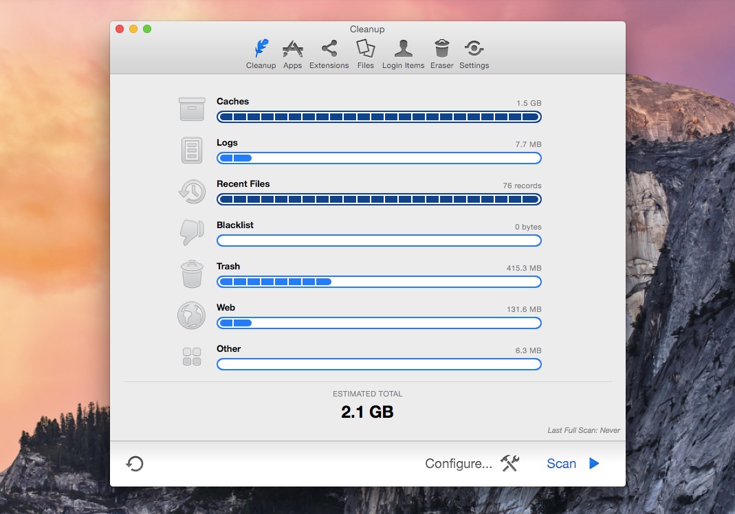 Apps, Extensions, Files, Login Items項目別にMacのストレージ内で容量を占めているファイルを抽出して削除できるユーティリティアプリ。販売元のKoingosw Softwareにトライアル版が有ります。