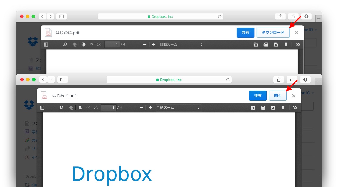 *Dropbox v3.2.3をインストールしてDropboxにアクセスすると[ダウンロード]が[開く]になります。