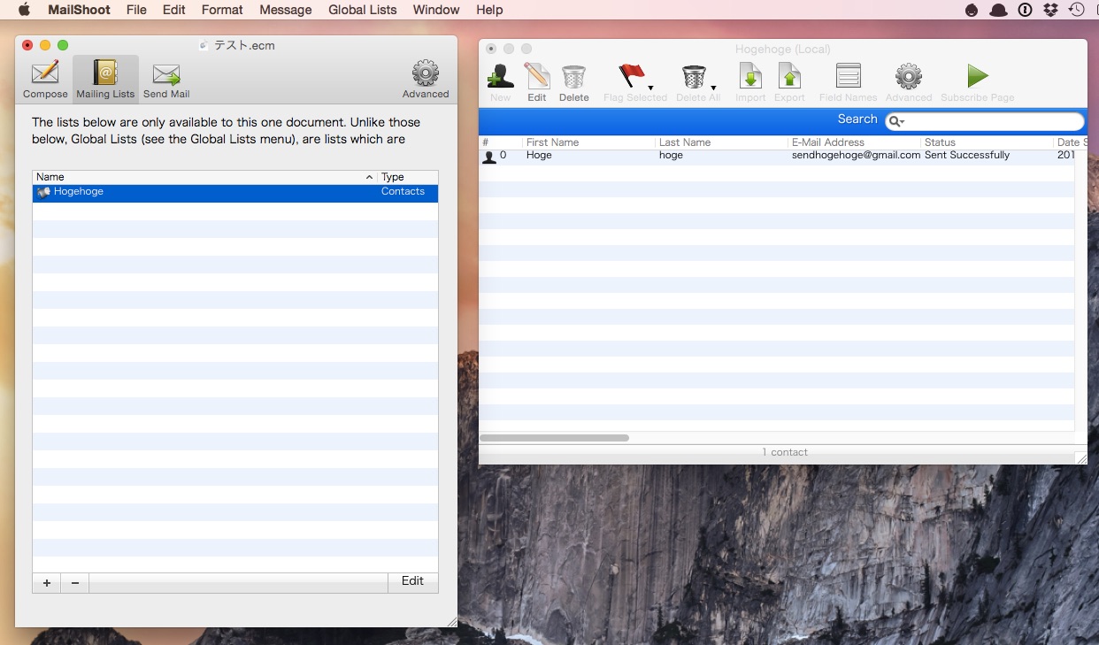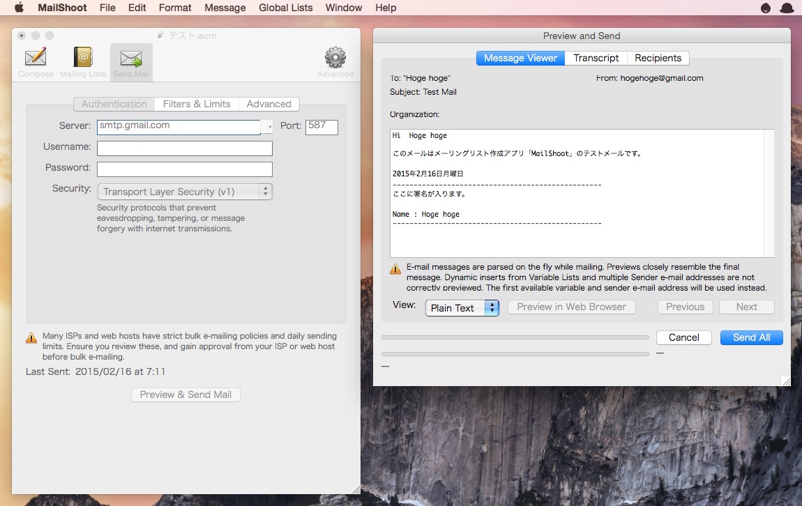 MailShootは送りたいメールのテンプレートとユーザー登録しておけば、変数を使用することで複数人に同様のメールを送信できるアプリで、OS X 10.10 Yosemiteにも対応していますがサポート終了に付き無料で提供されるそうです。