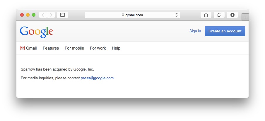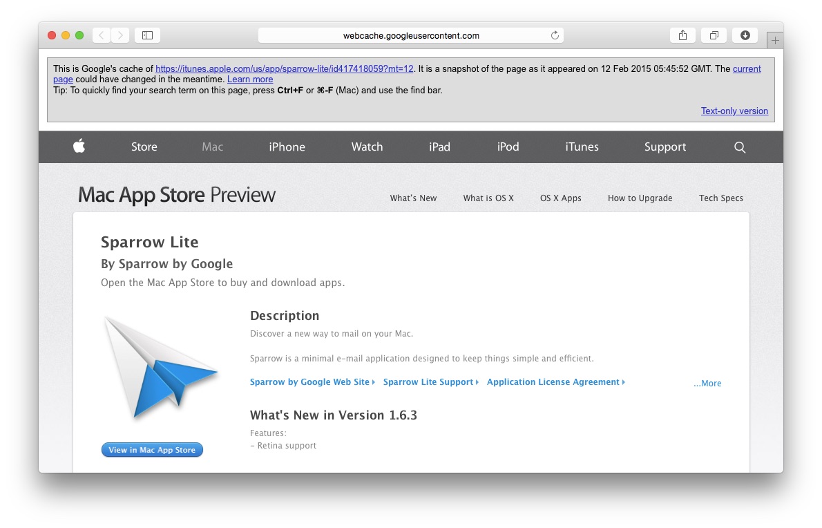 Google’s last cache of an active page for the $2.99 iOS app was made on February 12, while the $9.99 Mac app was last seen on February 13, and the free Mac app Sparrow Lite was also last seen February 12. Right now, if you really want it, you can still download Sparrow for Mac directly from Sparrow’s own web site.