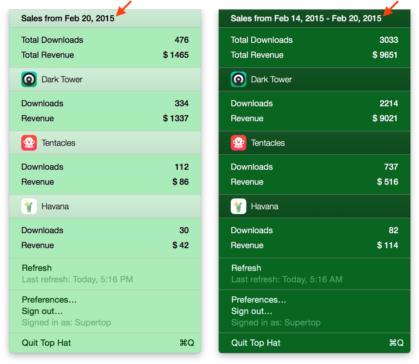 Top Hat lives in the Yosemite menu bar and shows up-to-date daily sales figures for your apps. Revenue from In-App Purchases is aggregated to give you a single total for each app. Weekly figures can be inspected by holding ⌥ as you click the Top Hat icon.