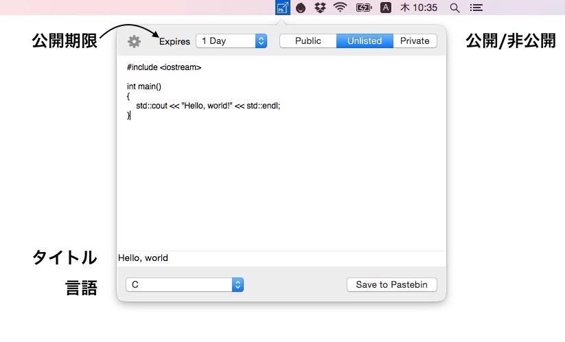 Pastebin It!はイギリスのPrism TechWalesが開発したMac用Pastebinクライアントで、ショートカットキーやドラッグ&ドロップでのファイル送信、CやJavaScript, Rubyなど250言語以上のシンタックスハイライト、公開期間の設定などに対応しています。