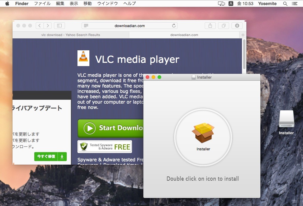 もあるので別に珍しいことでもありませんが、Lowellさんによるとそれ以外にもGoogleやYahooの広告(例えば”vlc download”で出てくる)などにもMac用のマルウェア インストーラー付きのアプリが配布されているサイトがトップに出てくる様になってきていとのことです。
