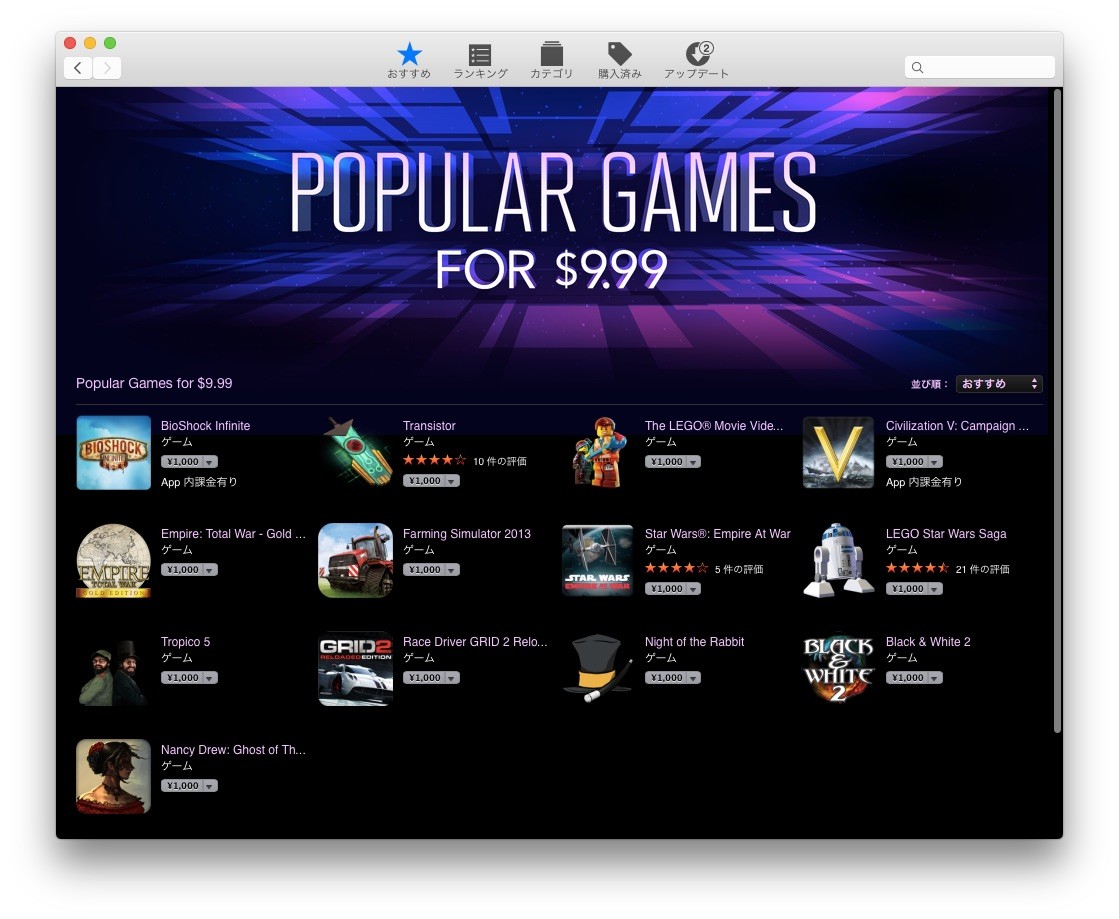 Apple、MacAppStoreで人気ゲームアプリを1000円で販売する「Popular Games for $9.99」セールを開催中。