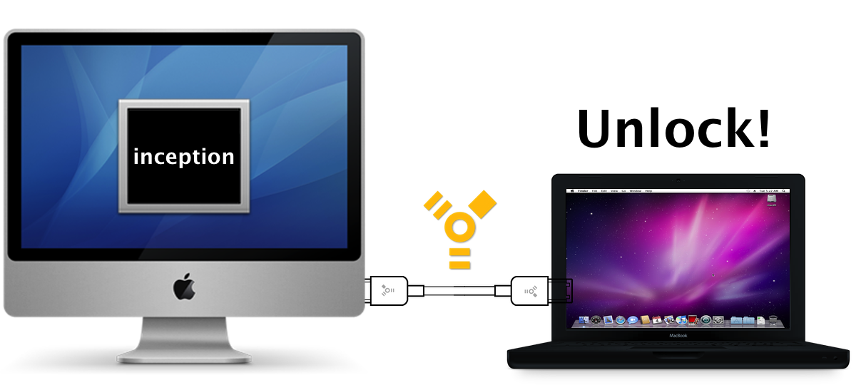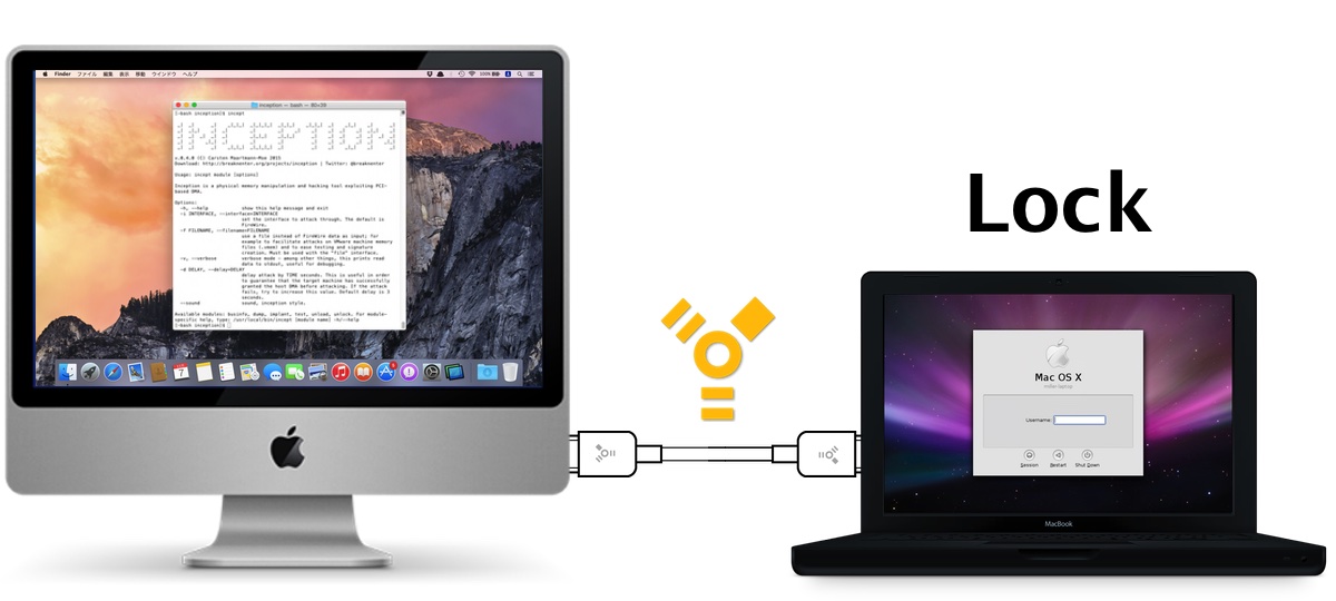 まず、inceptionをインストールしたMacと攻撃対象のMacをFireWireやThunderboltケーブルで接続し、攻撃対象のMacを起動しておきます。