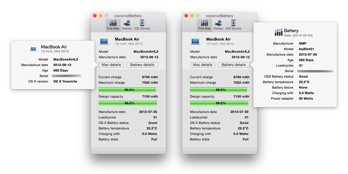 coconutBattery v3からバッテリー情報が更に詳しく表示されるようになっており、使用しているMac(MacBook)のモデルナンバーや製造年月日、Macに搭載されているバッテリーの製造年月日やバッテリー充電回数、シリアルナンバーなどが表示可能でしたが、
