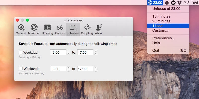 使い方はメニューバーアイコンの[Preferences…]からブロックするアプリやWebサイトをサイトを決定して、次にブロックする時間を選択すれば設定完了です。ブロックする時間はPomodoro Timerとスケジュール設定が可能で、