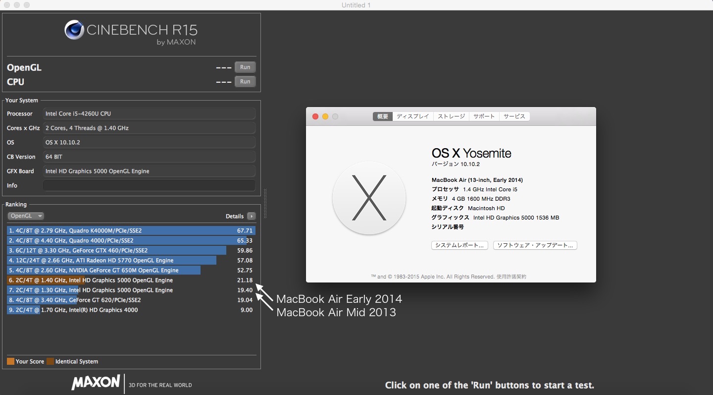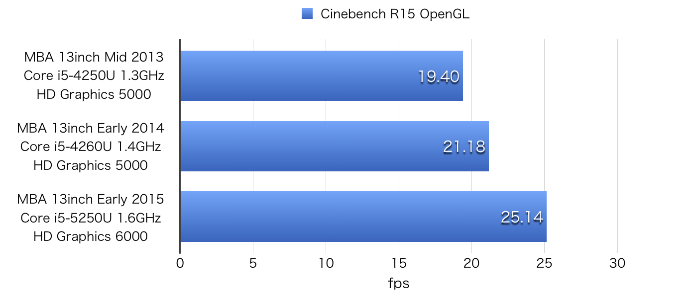 MacBook Air Mid 2013 ~ Early 2015までのGPUベンチマーク CINEBENCH R15のスコアまとめです。詳細は以下から。