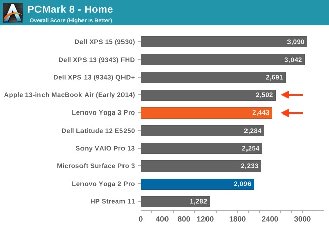 比較にはAnandTechが行ったPCMark 7のスコアが使用されており、スコアとしてはYoga 3 ProはMacBook Air (Early 2014)の下位モデル(Core i5-4260U:1.4GHz, Memory:4GB, GPU:HD Graphics 5000)の約90%程度になっているので、MacBook (Early 2015)も同程度になると予想しています。*PCMark 7ではYoga 3 Proが4515, MacBook Air (Early 2014)が4885, PCMark 8では前者が2443, 後者が2502。
