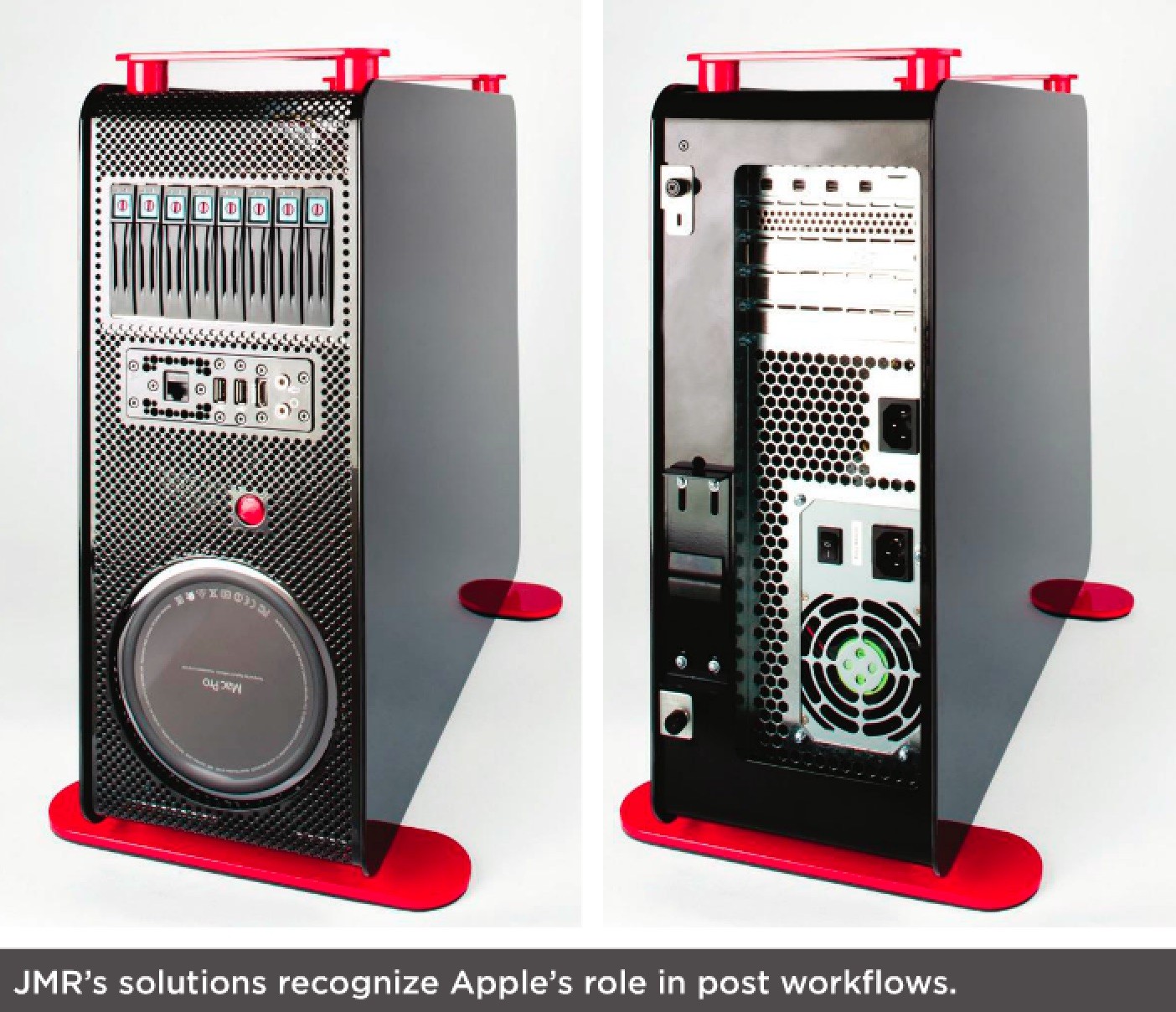 After sliding in the Mac Pro, internal connections bring out the USB, Ethernet and audio ports, as well as the power on/off switch to the front and Thunderbolt 2 connections made internally, with expansion ports on the rear panel. The product is available as a desktop/deskside tower or a 19” rack mount, using an optional conversion kit.Come see the Lightning Quad Tower, our new line of Thunderbolt 2 storage products and our latest family of enterprise storage systems at NAB 2015, Booth SL12117. If you need a free exhibits pass, just use our JMR Pass Code LV2358.