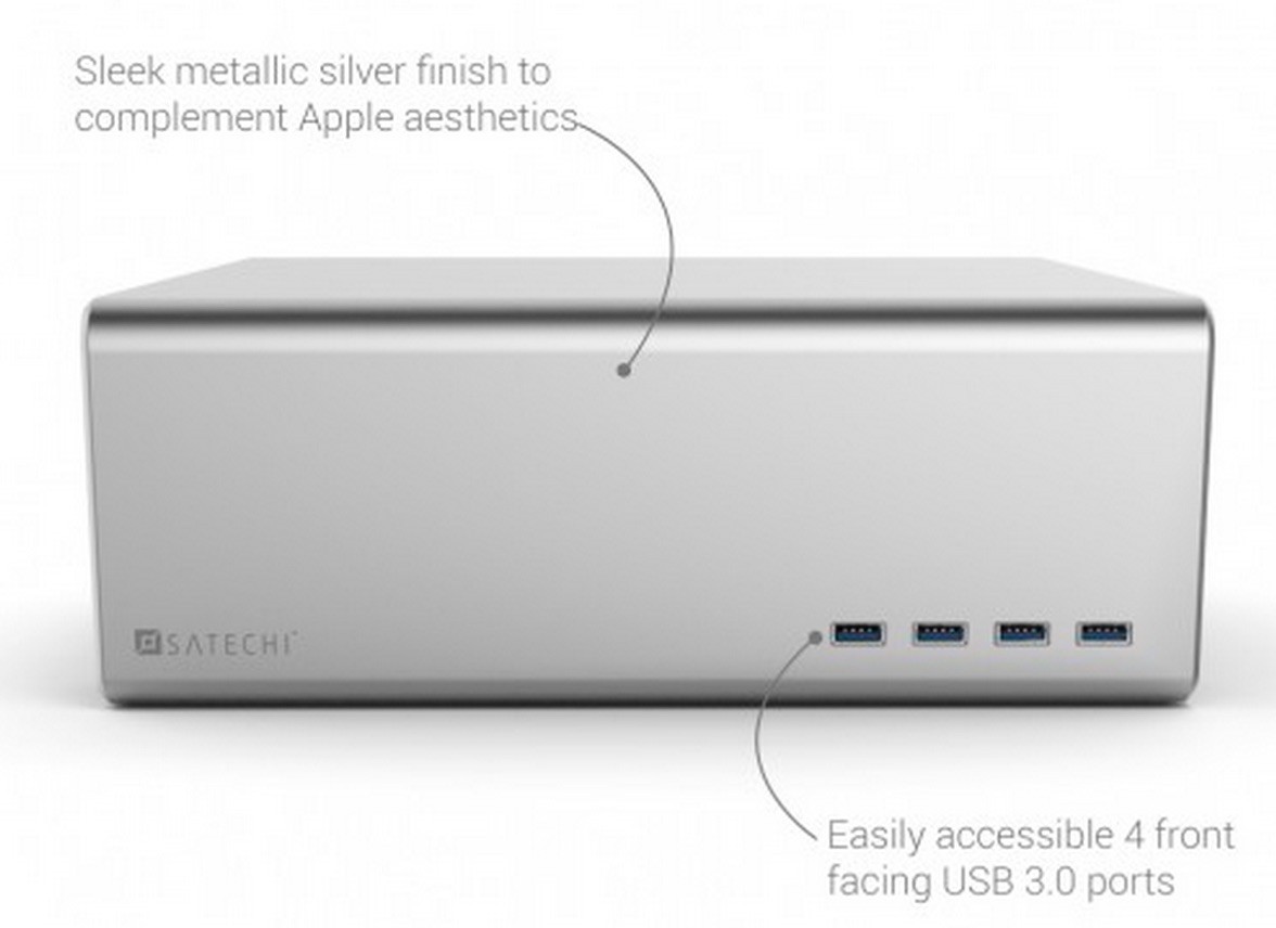 Standのサイズは高さ9.52 x 幅27.94 (裏は24.13)x 奥22.22 cmでMacと同様のアルミニウム製。前面にはUSB 3.0 (5Gpbs) ポートを4ポート備え背面にはUSBケーブルを通す穴が開いており、Stand内部にはApple Wireless Keyboardなどを収納できるようになっています