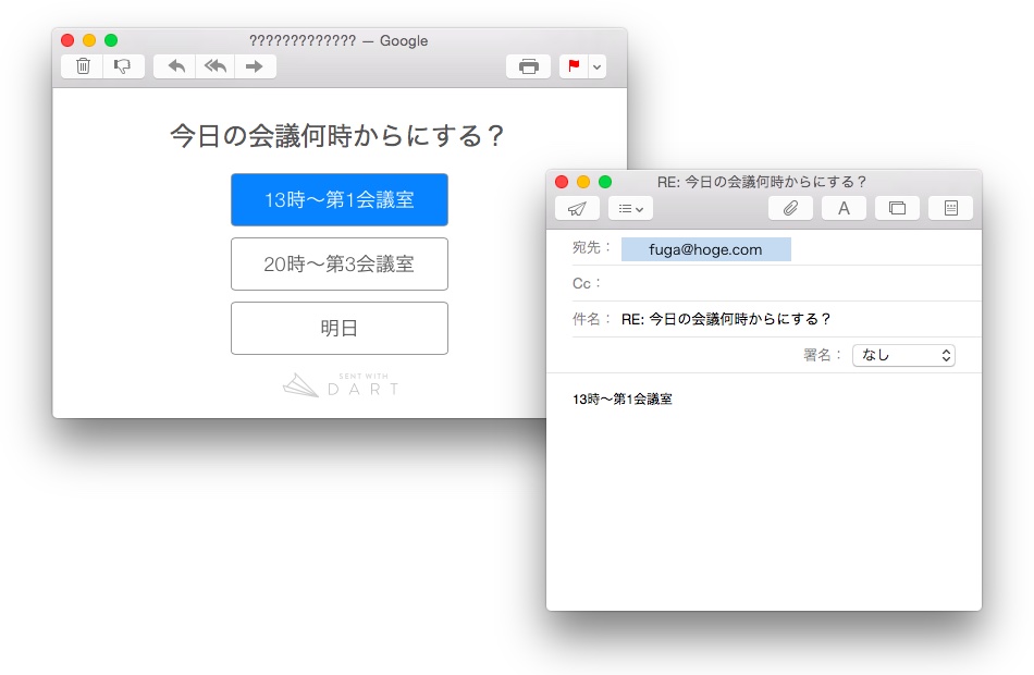 Dartは「Yes, Noなど単純な回答が欲しいメールが届かなくてイライラしたことありませんか?私達の調査では84%の人がそんな経験を持っていました。Dartは単純な回答をこちら(送信者)が設定してあげることで、受信者がすぐに返事を返せるように設計されたMac用メールクライアントアプリです」というユニークなメールアプリです。