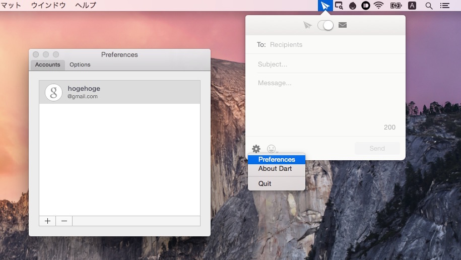 使い方はまず、Dartを起動してメニューバーのアイコンをクリックし送信者のメールアドレスとSubjectを入力。