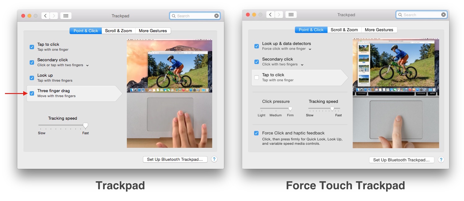 MacBook Pro (Retina, Early 2015)が発売されてからApple Support Communitiesなどで話題に上がっていた「感圧タッチトラックパッド搭載のMacBookのシステム環境設定 > [トラックパッド]から『3本指のドラッグ』が無くなった」問題についてAppleが公式サポートページを公開しています。