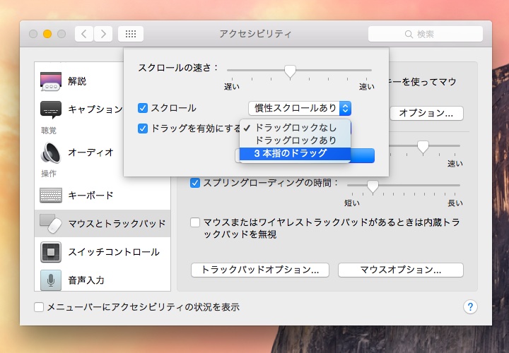 ・感圧タッチトラックパッド搭載のMacBookでは「3本指のドラッグ」の設定がアクセシビリティに移動しているもよう