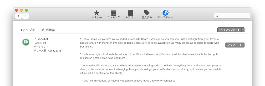 バージョン4ではOS X Yosemiteの共有メニュー拡張に対応し、システム中の共有メニューからプッシュ通知が送れるようになった他、(右クリックの)コンテキストメニューからもファイルや画像などを送れるようになっています。