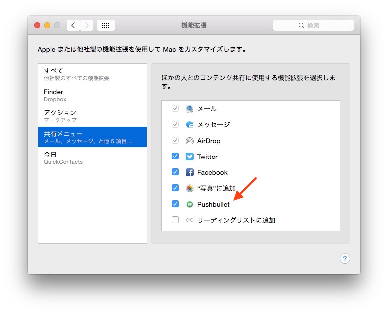 共有メニューに表示させるためにはシステム環境設定の[機能拡張] > [共有メニュー]でPushbulletをONにする必要があります。