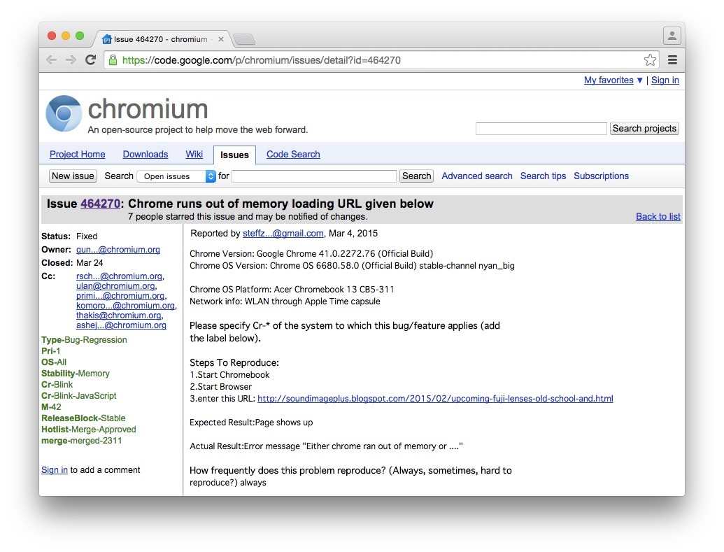 この不具合のChromium Code Reviewsは既にClosedされており、Google Chrome Canary 43.xではクラッシュしなかったので次期アップデートで修正されると思いますが、Mac/Windowsプラットフォームの最新のGoogle Chrome 41.xでも再現されるので注意して下さい。