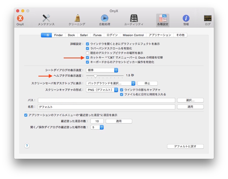 各種設定メニューの[一般]からはホットキー(Control + Option + Command + T)でYosemiteのLight/Darkモードを切り替えられる機能のON/OFFの他、ヘルプタグ(いわゆるツールチップ)の表示速度が変更可能です。
