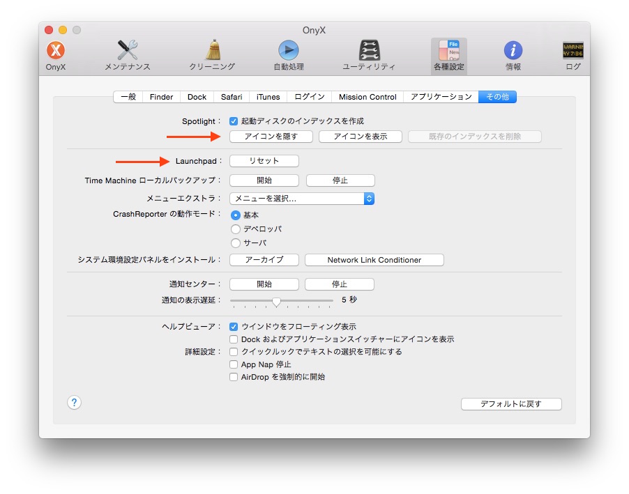 LaunchpadのリセットとSpotlightアイコンの非表示
