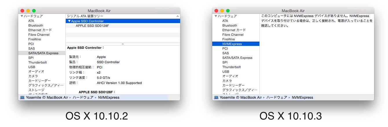 AppleはOS X 10.10.3 Yosemiteで次世代SSDのための新プロトコル「NVM Express」をサポートした様です。詳細は以下から。