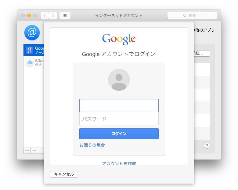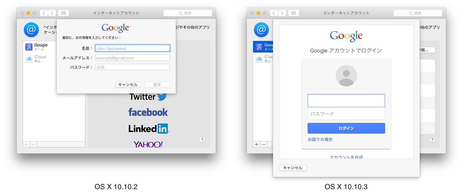 OS X 10.10.3のシステム環境設定.app [インターネットアカウント] > [Google]を選択すると、OS X 10.10.2までのアカウント入力フォームでなくWebベースのログインウィンドウが表示され、OS X のシステムアカウントに2段階認証を適用しているGoogleアカウントを設定できます。
