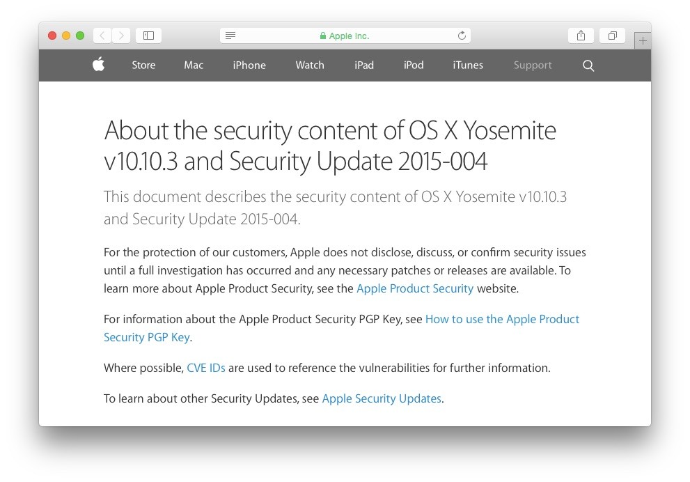 AppleがOS X Yosemite 10.10.3とSecurity Update 2015-004で修正した脆弱性の一覧を公開しています。詳細は以下から。