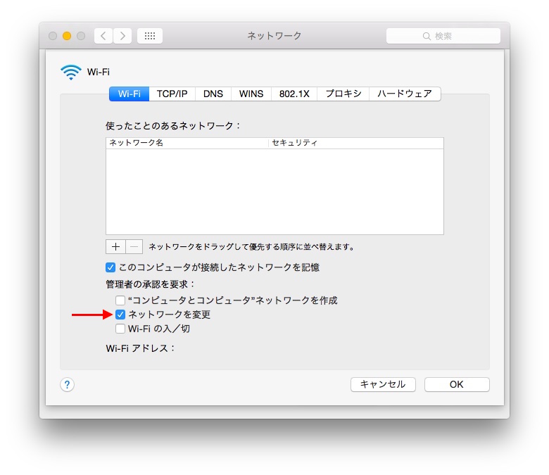 YosemiteのWi-Fi問題の対処法は様々提案されていますが、比較的簡単なのがシステム環境設定の[ネットワーク] > Wi-Fiを選択 > [詳細…] > [Wi-Fi]タブ > [ネットワークを変更]をON > [OK]にする方法や、