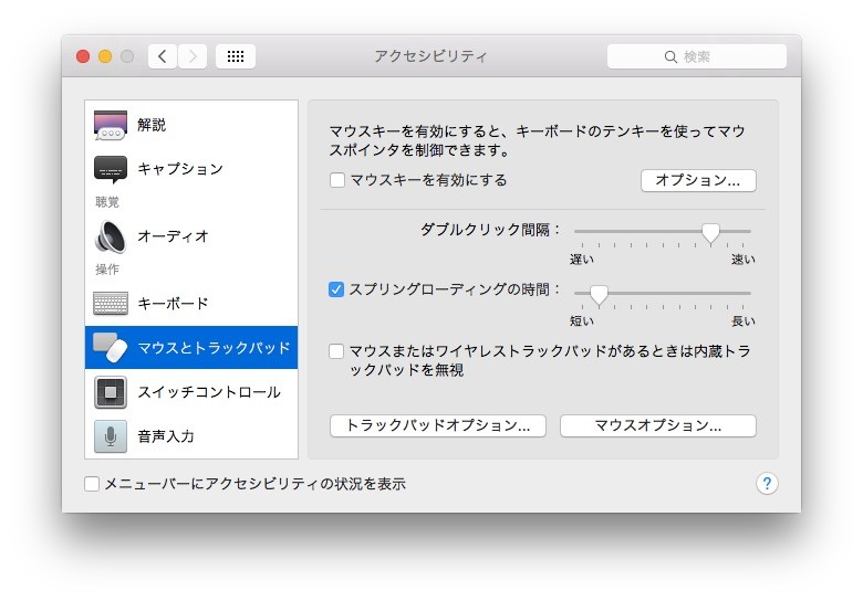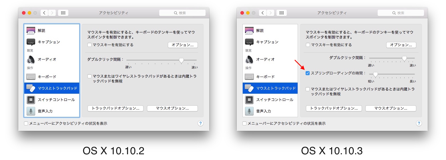OS X Yosemite 10.10.3ではFinderのスプリング設定がシステム環境設定のアクセシビリティへ移動しています。詳細は以下から。