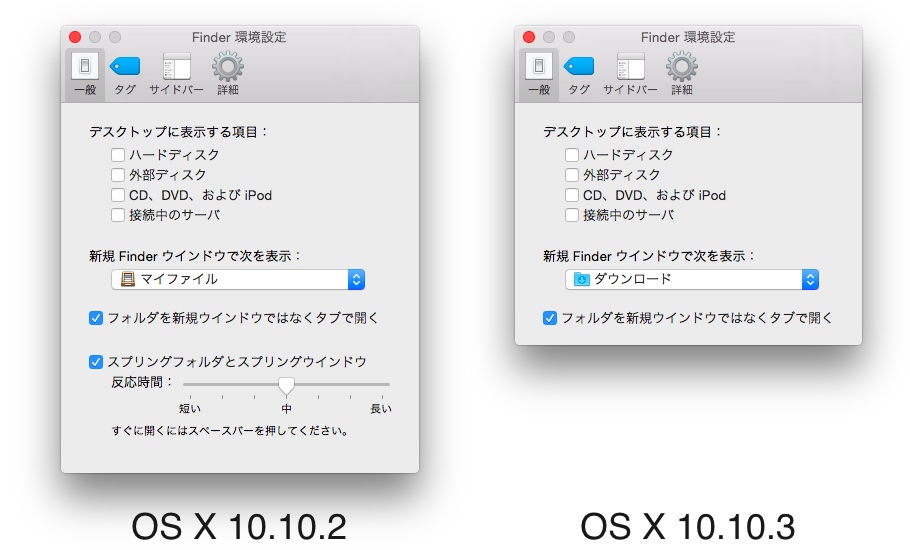 Finderの環境設定から「スプリングファイルとスプリングウィンドウ」の設定が消えており(スプリング機能はファイルをドラッグしフォルダやDockにマウスオーバーすると、そのフォルダで開いてくれる機能)、