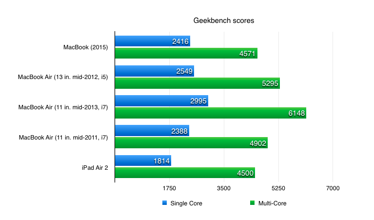 Macworldの方に掲載されたGeekbeenchスコアのグラフはJasonさんが所収する全てのMacBookを引張り出してきて、同じ環境(Yosemite & Geekbench 3)で比較しており、それによると新しいMacBookは4年前に購入したMacBook Air Mid 2011の上位モデル CPU 1.8 GHz (i7-2677M) 以下か同程度となっており、