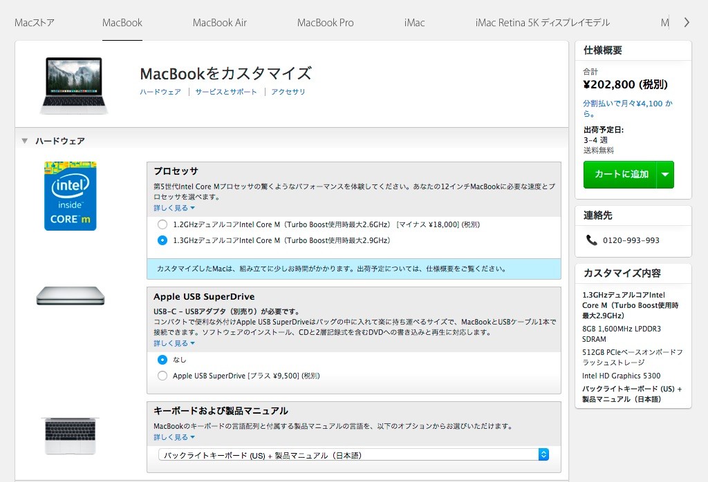 新しいMacBookは仕上げがシルバー、ゴールド、スペースグレイの3種類から選択でき、ベースモデルがIntel Core M 1.1GHz/256GB PCIe SSDで148800円、上位モデルがIntel Core M 1.2GHz/512GB PCIe SSDで184800円となっており、CTOオプションとしてIntel Core M 1.3GHzがそれぞれ+30000円、+18000円で選択可能です。