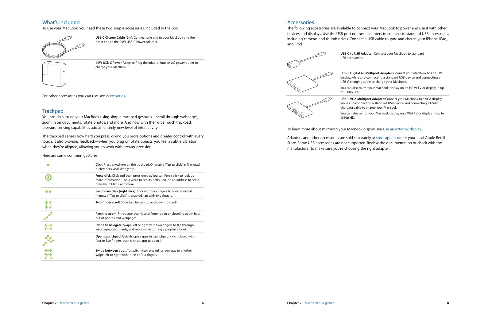 内容は他のMacとあまり代わりませんが、MacBook Pro (Retina, Early 2015)と新しいMacBook (Retina, 12-inch, Early 2015)で採用された感圧タッチトラックパッドの説明やUSB-C用の新しいアダプター類の説明が記載されています。
