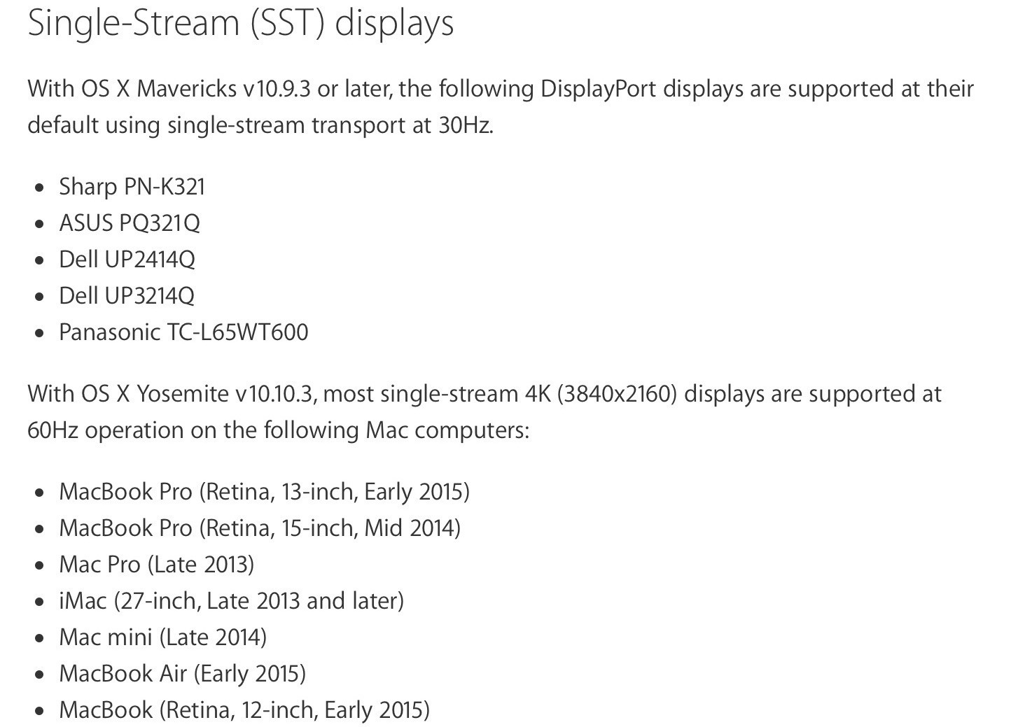 With OS X Yosemite v10.10.3, most single-stream 4K (3840×2160) displays are supported at 60Hz operation on the following Mac computers: