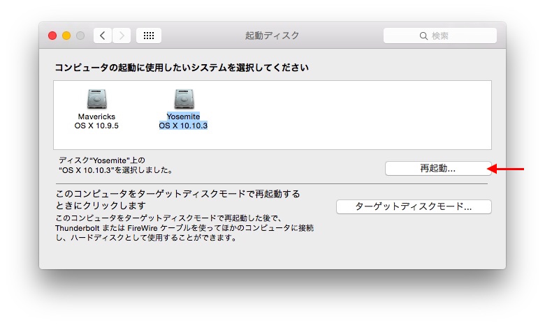 1.システム環境設定.appから起動ディスクを選択し、[再起動…]ボタンを押してMacを再起動します。(これで直らない場合は2.へ進んで下さい)