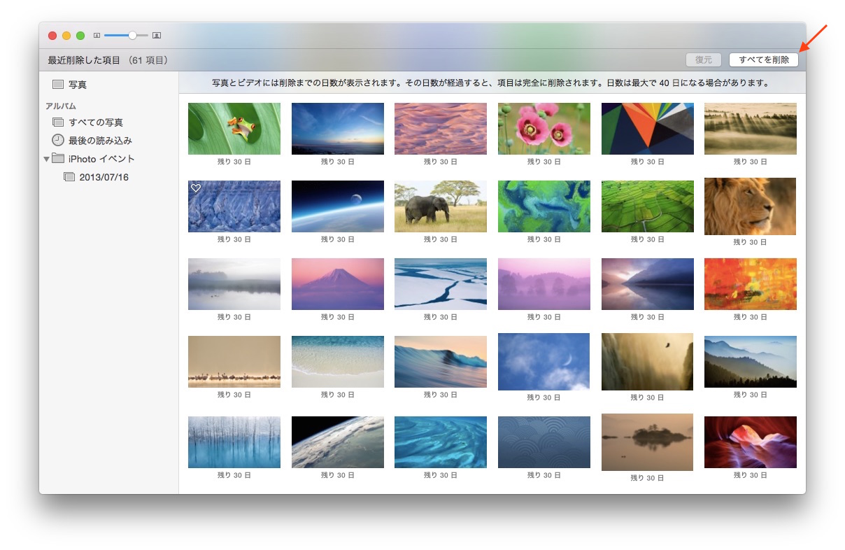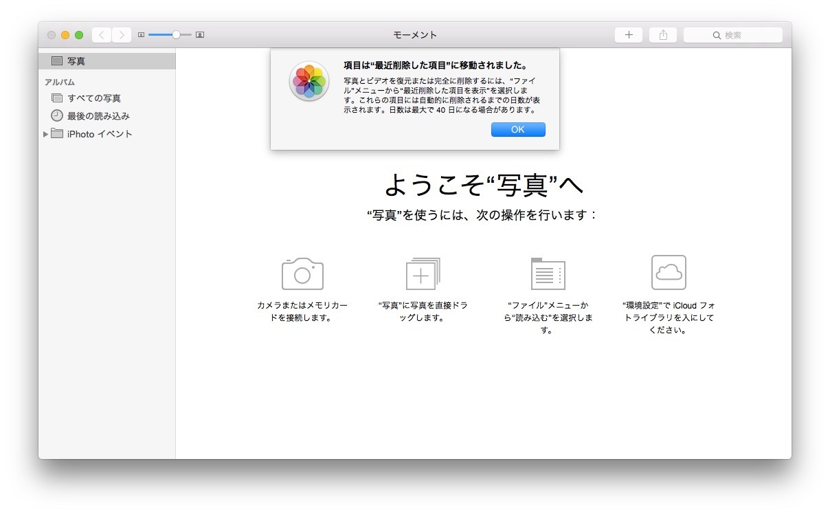 手動で写真を選択し[削除]を押すか、削除されるまでの日数が経過しない限り完全に削除されません。iOS 8の写真アプリは最大30日ですが、Macの写真アプリは最大で40日になる場合があるようです。