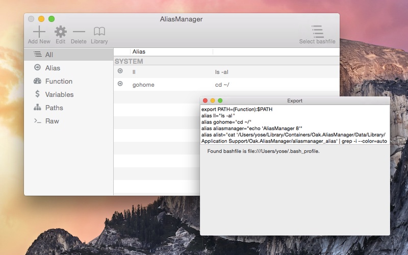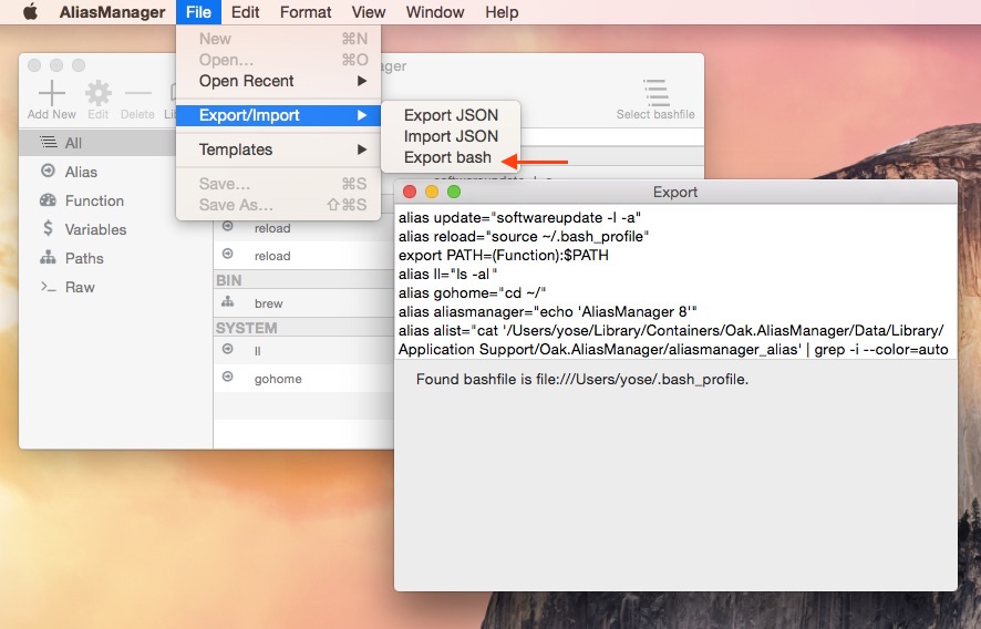 入力が終わったら、[File] > [Export]から出力できるので.bash_profileに保存して$sourceでエイリアスを反映させて下さい。