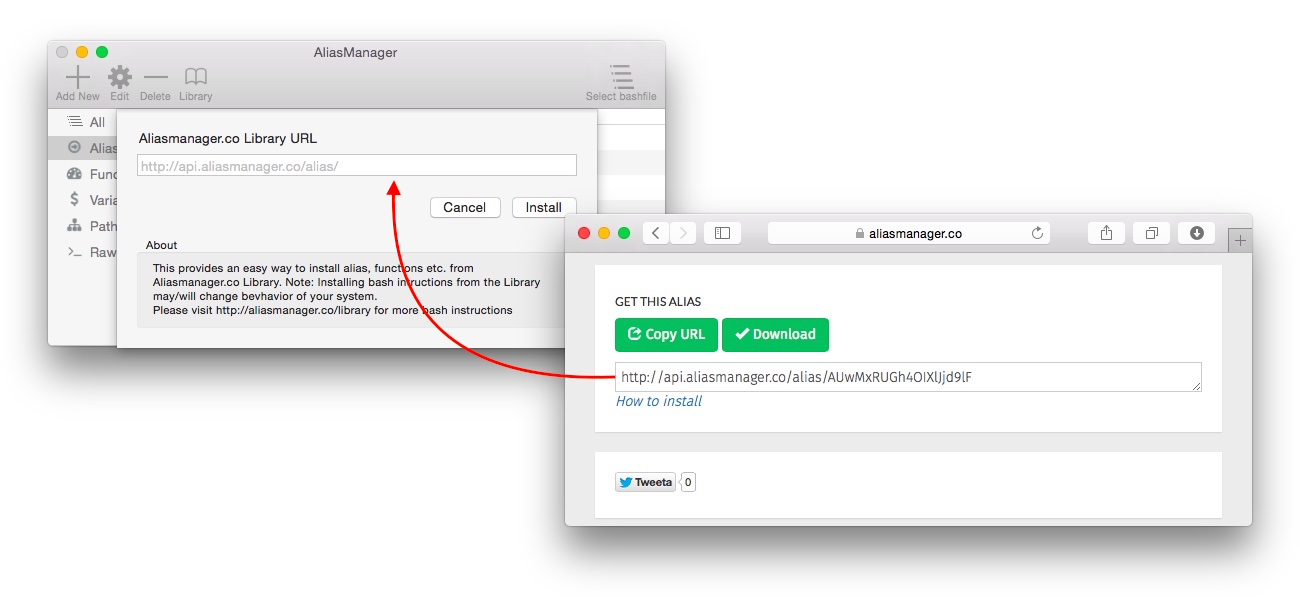 AliasManagerのサポートサイトでは”AliasManager library”があり、Library URLをLibraryウィンドウに入力することで、Aliasmanager.coが提供するエイリアスなどをインポートすることが可能です。