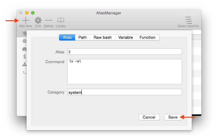 次にエイリアスを作成していきます、ウィンドウ左上の[Add New]をクリックしてエイリアスを作成、[Save]を押して保存します。AliasManagerはエイリアスの他にPATHや変数、関数などが追加できます。
