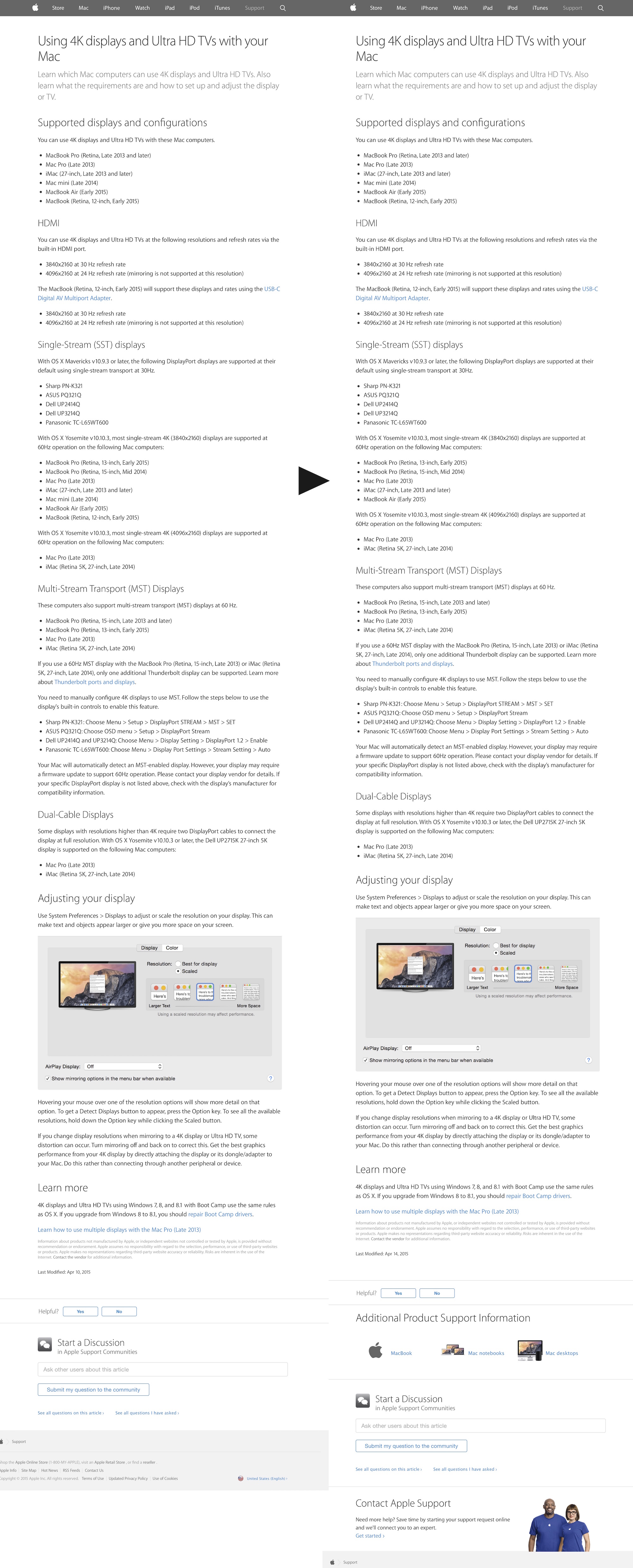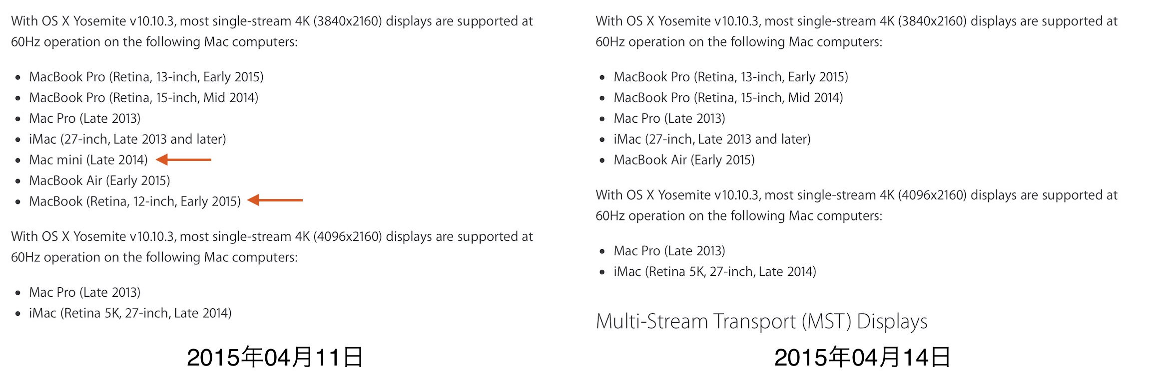 Appleは現地時間14日付でサポートページ”Using 4K displays and Ultra HD TVs with your Mac”を更新し、SST接続での4K(3840×2160)@60Hz対応Mac一覧からMac mini (Late 2014)とMacBook (Retina, 12-inch, Early 2015)を削除しています。