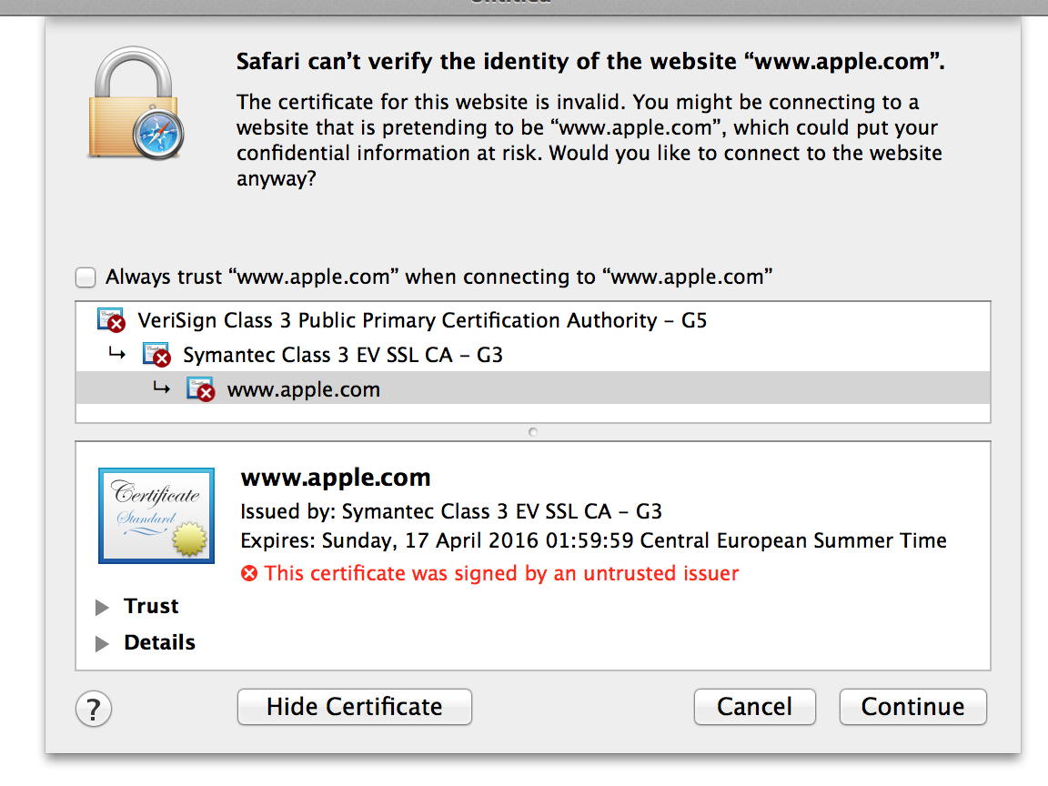 Apple Support Communitiesでは「この不具合はセキュリティアップデート 2015-004を適用したMac(OS X 10.8.5 Mountain Lion ~ 10.9.5 Mavericks)のVeriSign SSL証明書で発生する」とされていますが、InfoWorldでは「OS X 10.10.3 YosemiteにアップデートしたMacのGeotrust/Equifax SSL証明書で発生する」としているので4月9日に行われたOS Xのアップデートを適用したMac全般で発生するようです。