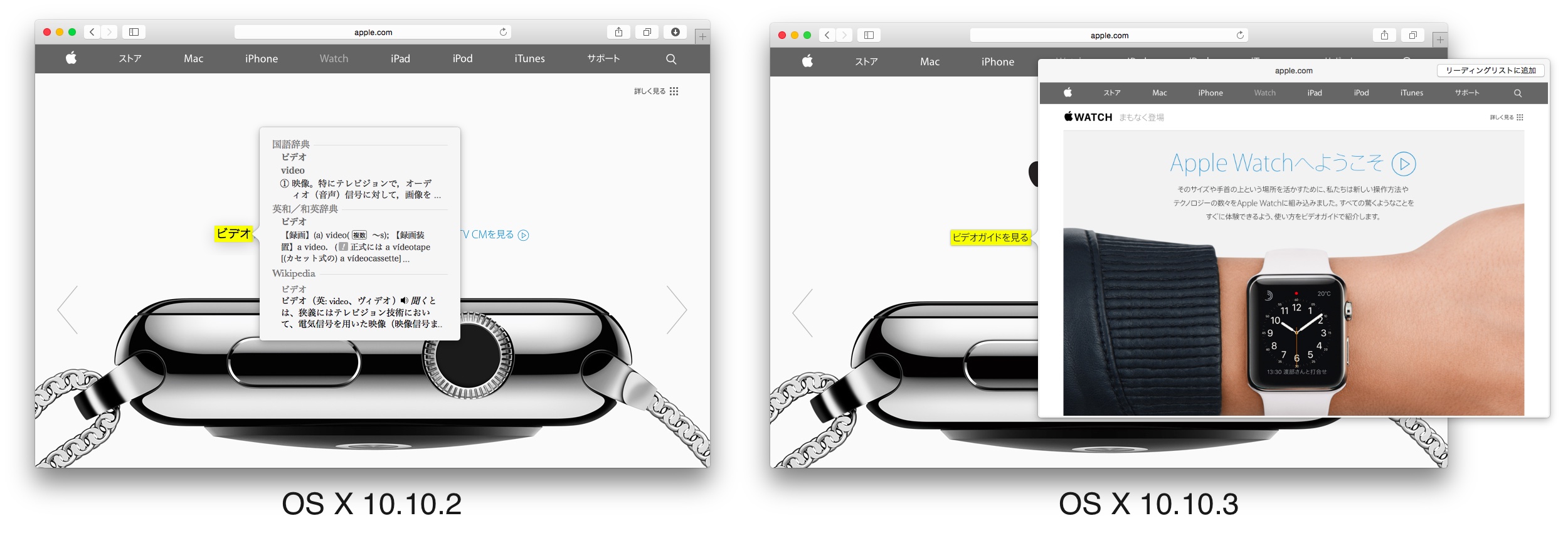 OS X 10.10.3からは感圧タッチトラックパッドの「強めのクリック」やMagic Trackpadの「3本指でタップ」でSafariで表示したWebサイト内に含まれるリンクのポップアッププレビューや