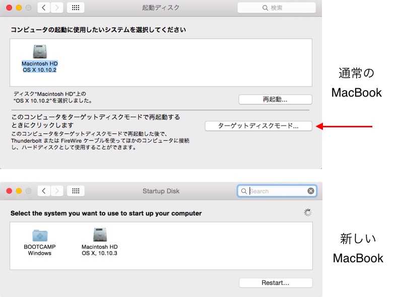 ちなみに新しいMacBookのシステム環境設定 > [起動ディスク]には「ターゲットディスクモード」のオプションがなくなっているので、新しいMacBookをターゲットディスクモードで起動するには「Tキーを押しながらMacBookを起動する」必要があるようです。