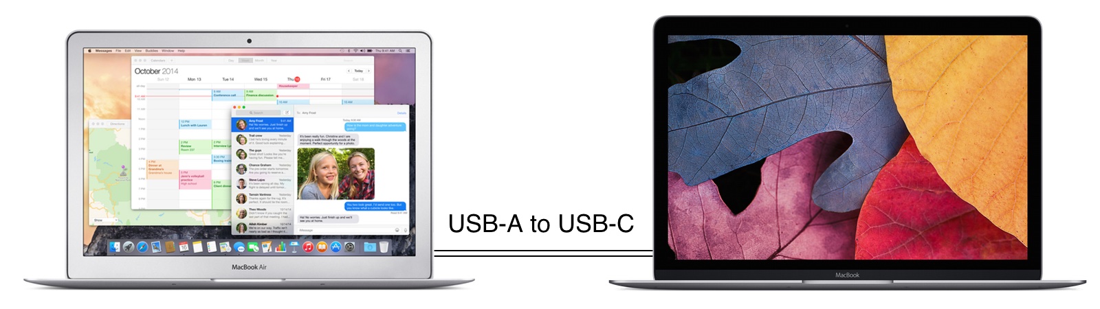 USB 3.0またはUSB 3.1に対応したUSB-C to USB-Cケーブルを使用し、両方のMacBookがUSB-Cポートを搭載の場合はターゲットディスクモードでの設定アシスタントと移行アシスタントが可能。注:Appleでは現在このケーブルを取扱っていません。