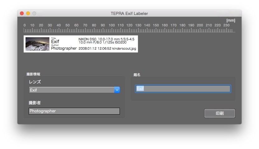TEPRA Exif Labelerはキングジムのラベルライター「テプラ」シリーズのPRO SR970, SR950, SR750, SR550, SR5900P, SR3900P, SR3700P用の写真情報ラベルアプリで、アプリウィンドウに写真(jpeg, tiff, psdに対応)をドラッグ&ドロップしてやるだけでExif情報が記載されたラベルが作成されます。