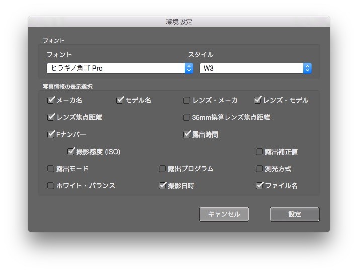 ラベルに記載するExif情報は[環境設定…]から選択可能で、プリンタドライバ(TEPRA Driver)をインストールすればそのまま印刷も可能のようです。システム要件はOS X 10.9, 10.10でプリンタドライバは公式サイトから別途ダウンロードする必要があるそうです。