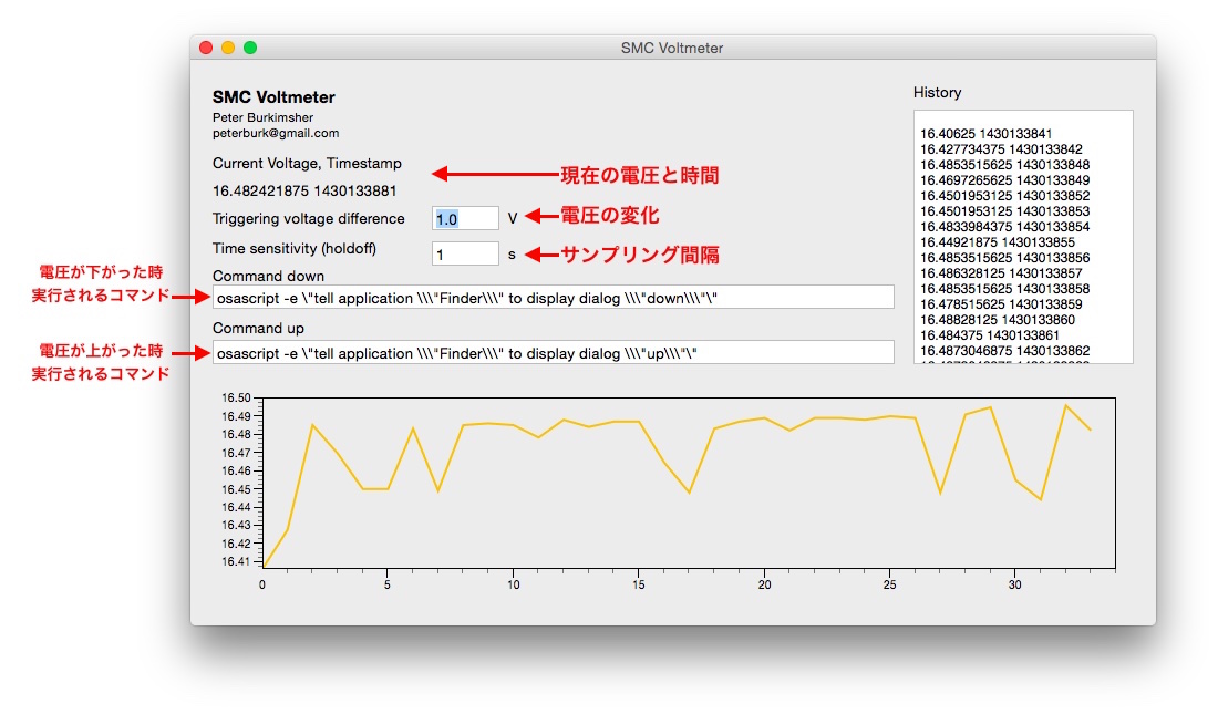 SMC Voltmeterはインドの開発者Peter(@peterburk)さんが開発したアプリで、MacBookに使用されているMagSafeポートにかかっている電圧を毎秒監視し、電圧に一定の変化があるとそれをトリガーにスクリプトを実行します。